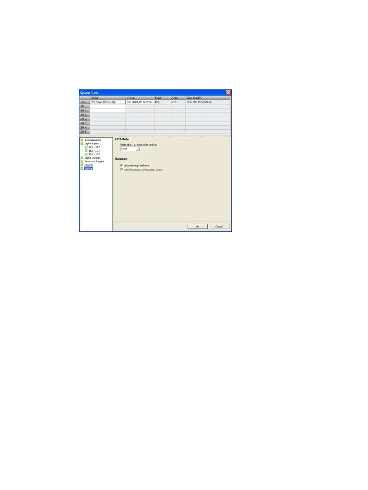 Click the Startup node of the system block (Page 115) dialog to configure startup options for