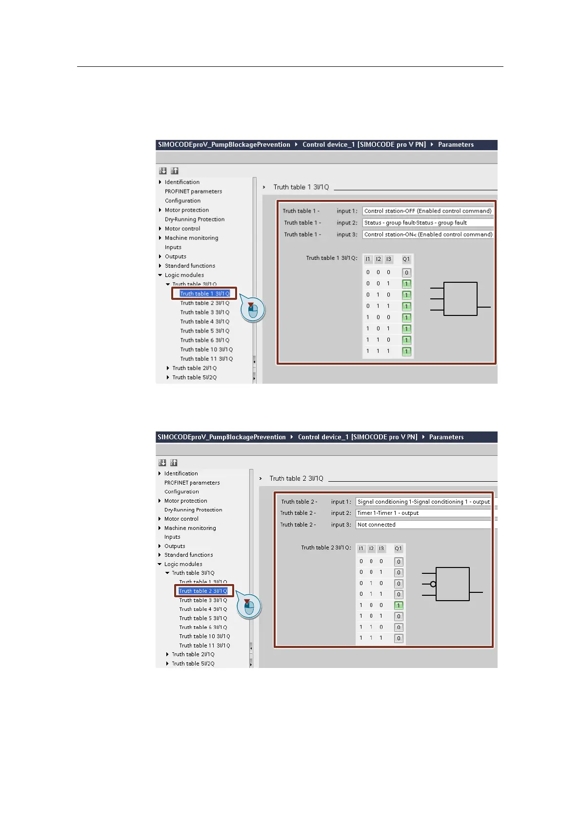 1. Under "Logic modules > Truth table 3I/1O > Truth table 1", define the signals