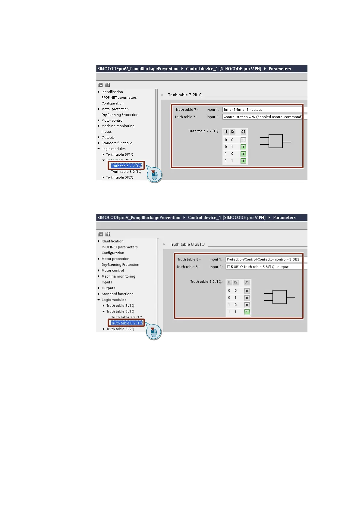 7. Under "Logic modules > Truth table 2I/1O > Truth table 7", define the signals