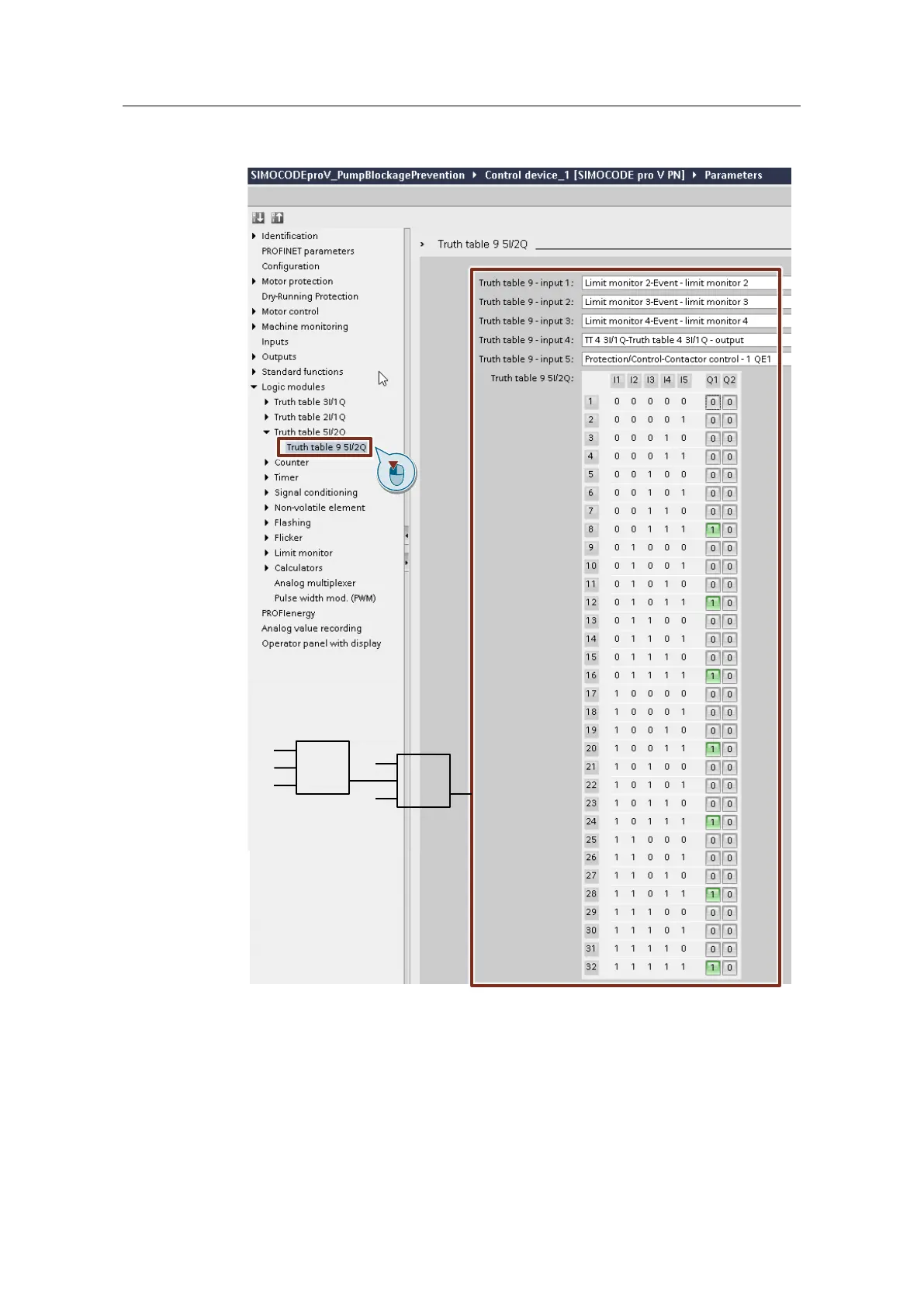 9. Under "Logic modules > Truth table 5I/2O > Truth table 9", define the signals