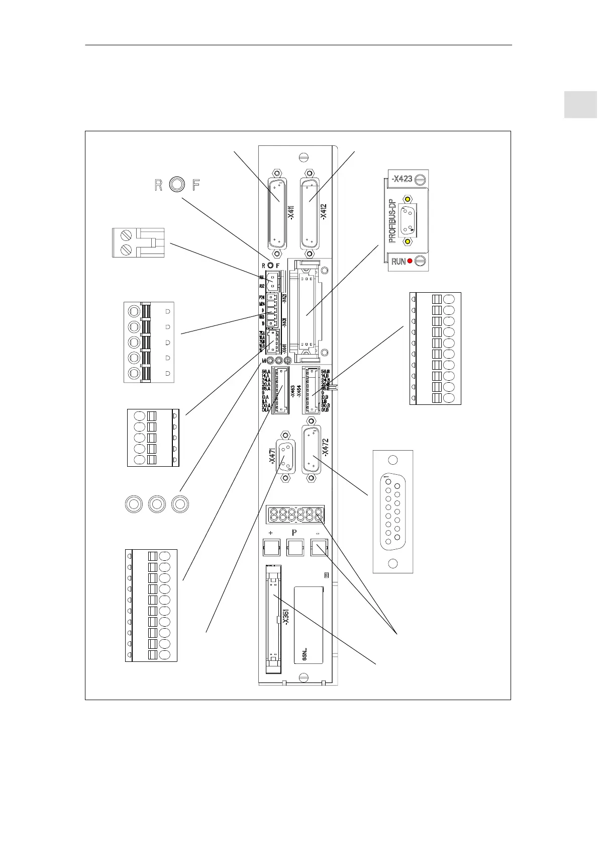 Fig. 1-10 Elements on the front panel of ”SIMODRIVE 611 universal E”