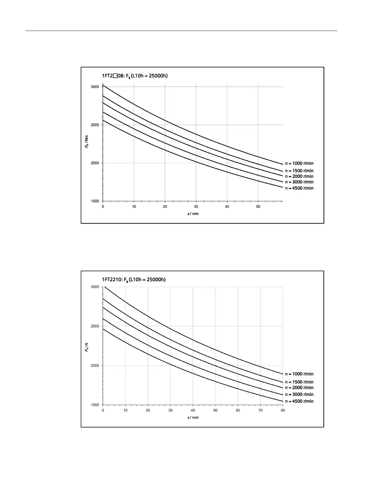 Figure 3-7 Maximum permissible radial force FR at a distance x from the flange for a nominal bearing