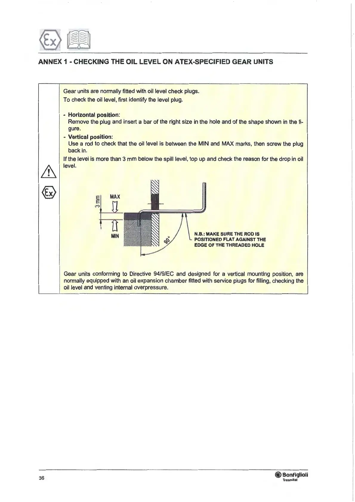 Gear units conforming to Directive 94/9/EC and designed for a vertical mounting position, are