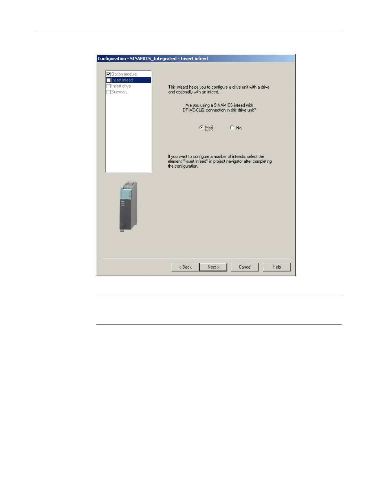you have selected an uncontrolled infeed without a DRIVE-CLiQ connection, omit steps