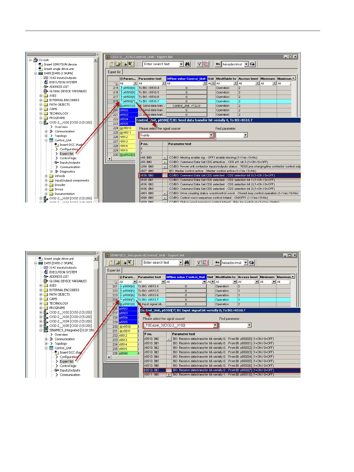DO CU_LINK (r8510.7) of the CX32‑2 (X102) to DO CU_I (cu.p8500[7]).