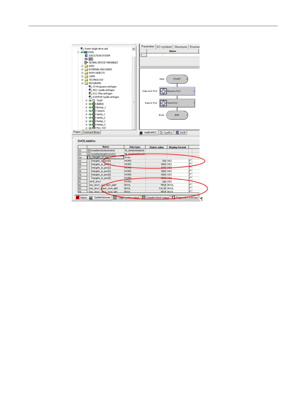 The "FB_TargetsPLCToAddOn" function block copies word 1 (targets_io_piw[0]) to the
