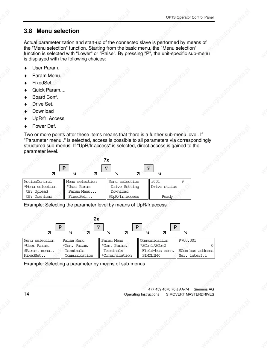 "Parameter menu.." is selected, access is possible to all parameters via correspondingly