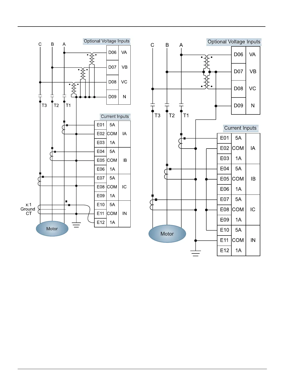 Siemens SIMPRO-100 - Figure 2.6 Example AC Wiring Diagram, Four-Wire Wye Voltages and Ground CT; Figure 2.7 Example AC Wiring Diagram, Open-Delta Voltages and Residual in Connection