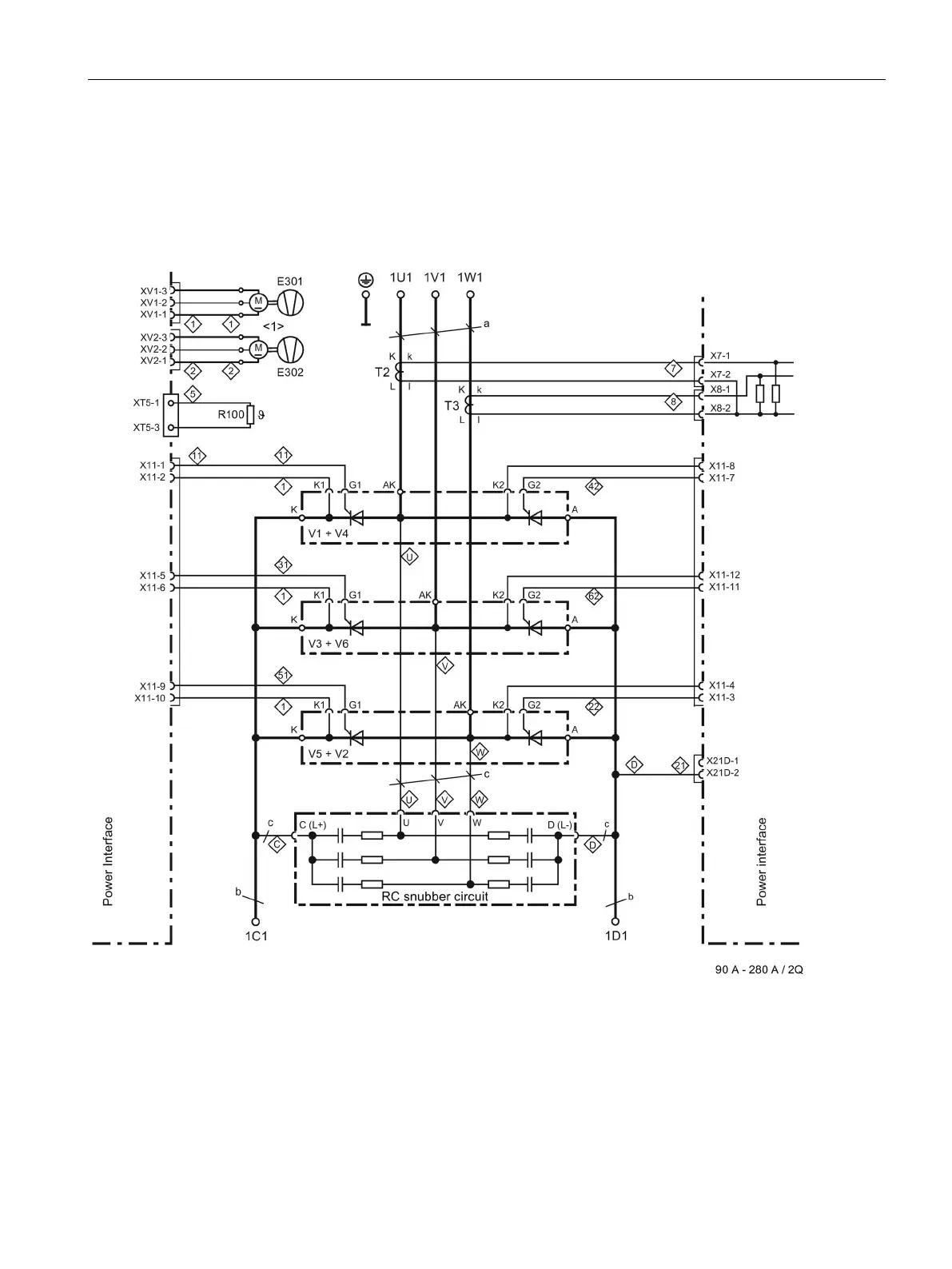 Figure 6-26 Power connections for 90 to 280 A/2Q devices