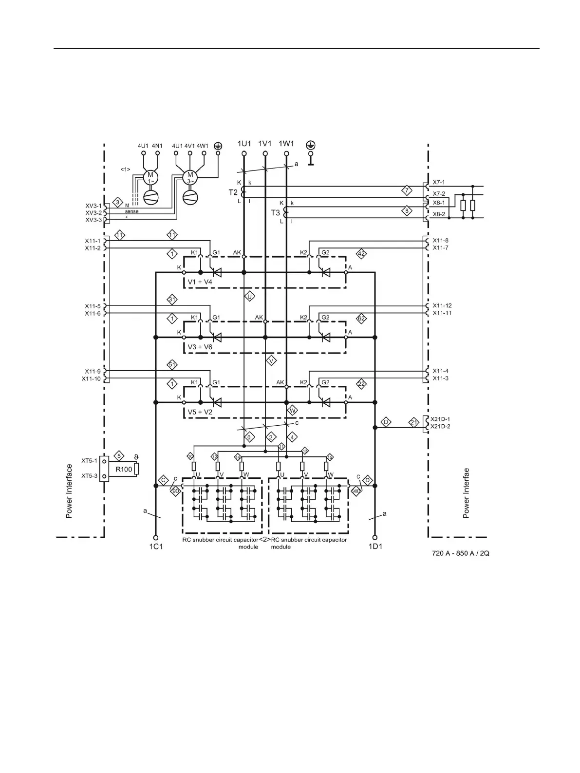 Figure 6-28 Power connections for 720 to 850 A/2Q devices