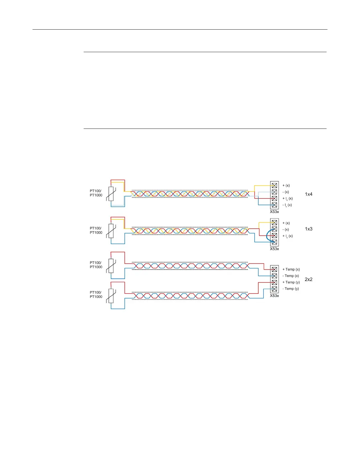 Figure 7-31 Connecting a PT100/PT1000 with 2x2, 3 and 4-wires to the temperature sensor inputs