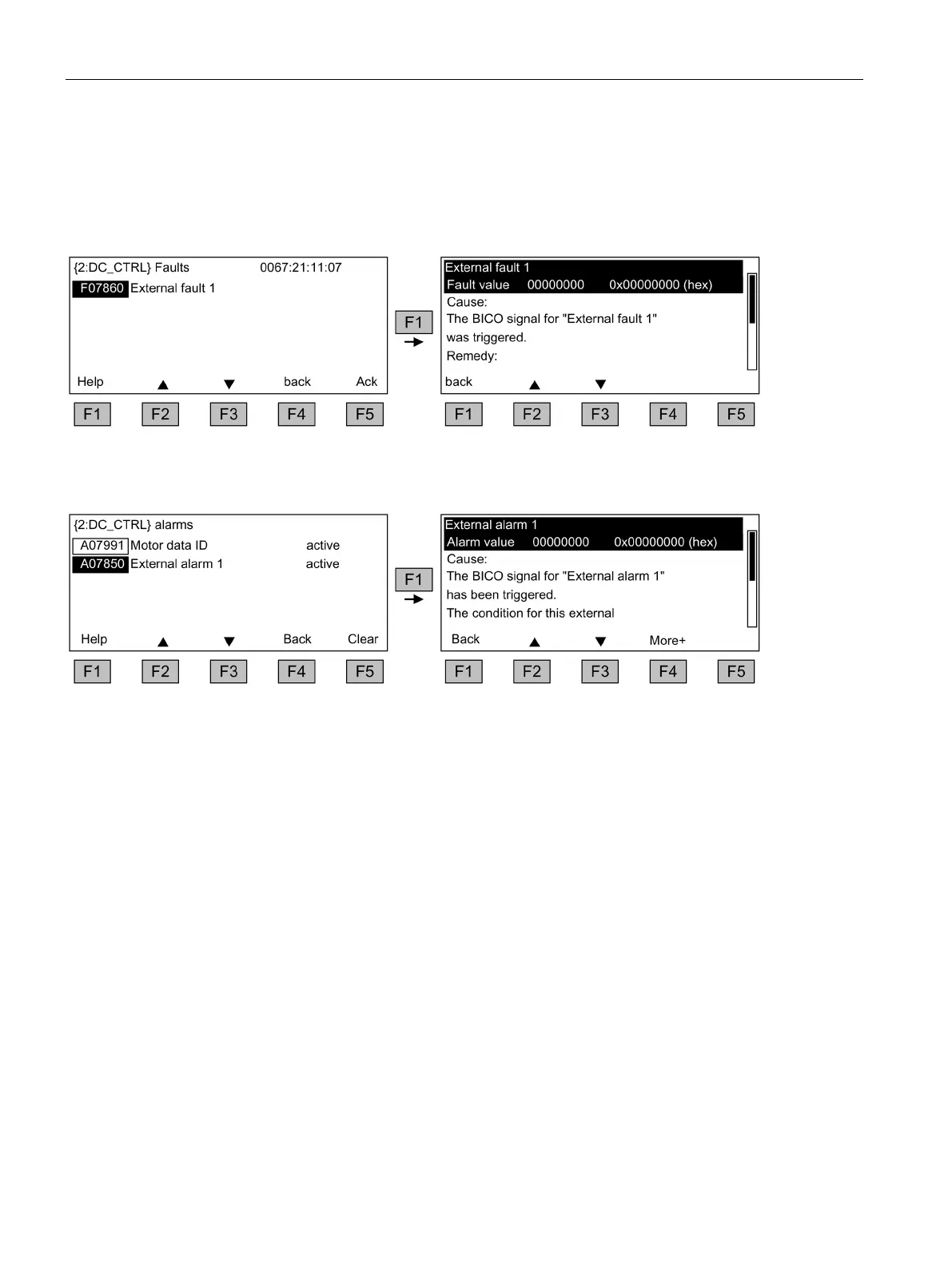 Alarms that are no longer active are removed from the alarm memory with F5 (Clear).