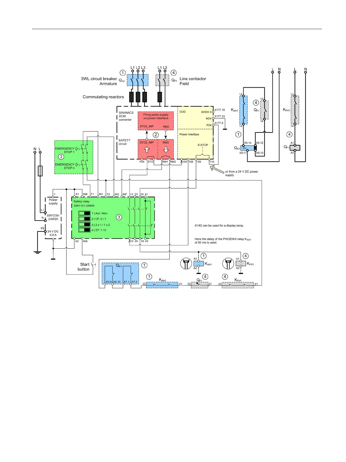 Contact blocks for field excitation (gray): Line contactor field + field auxiliary contactor (also as the field contactor is