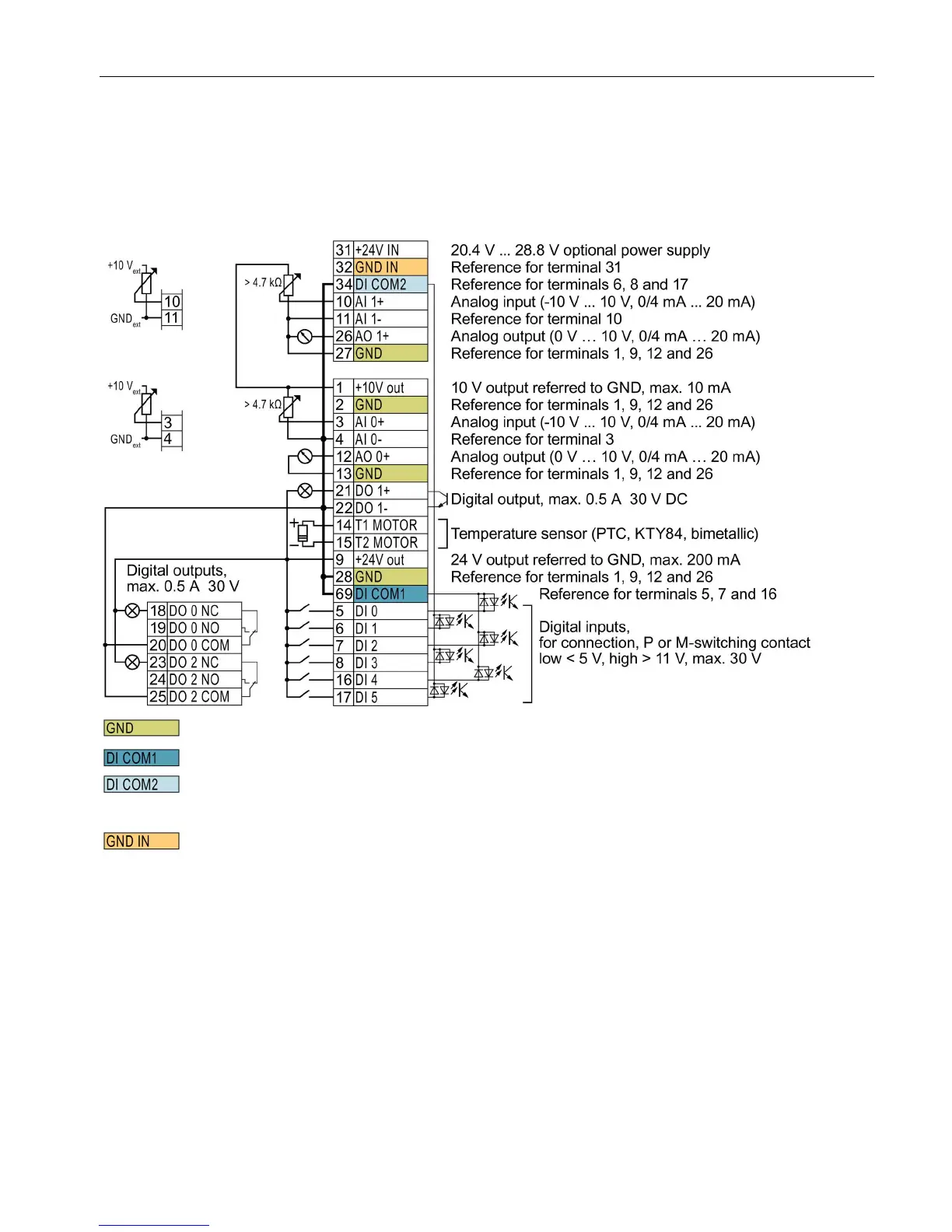 All terminals labelled with reference potential "GND" are connected internally in the inverter.