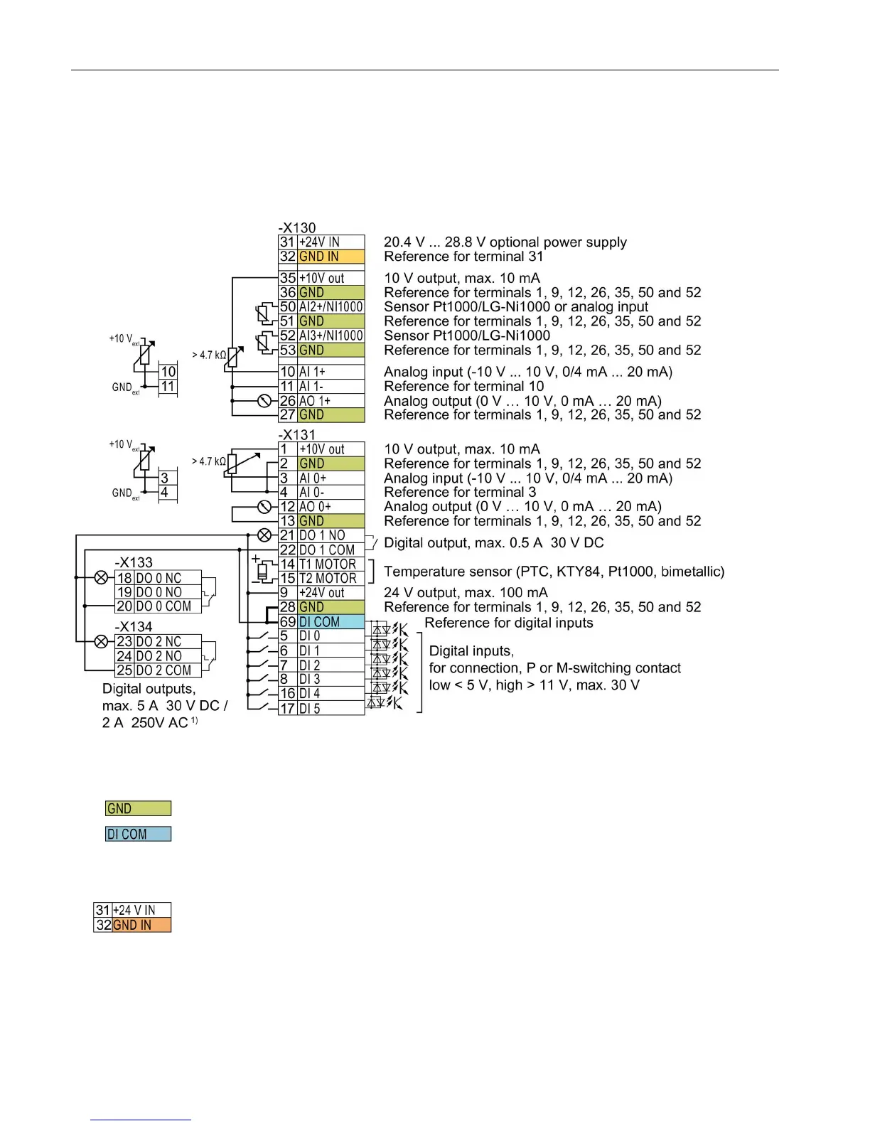All terminals labelled with reference potential "GND" are connected internally in the inverter.