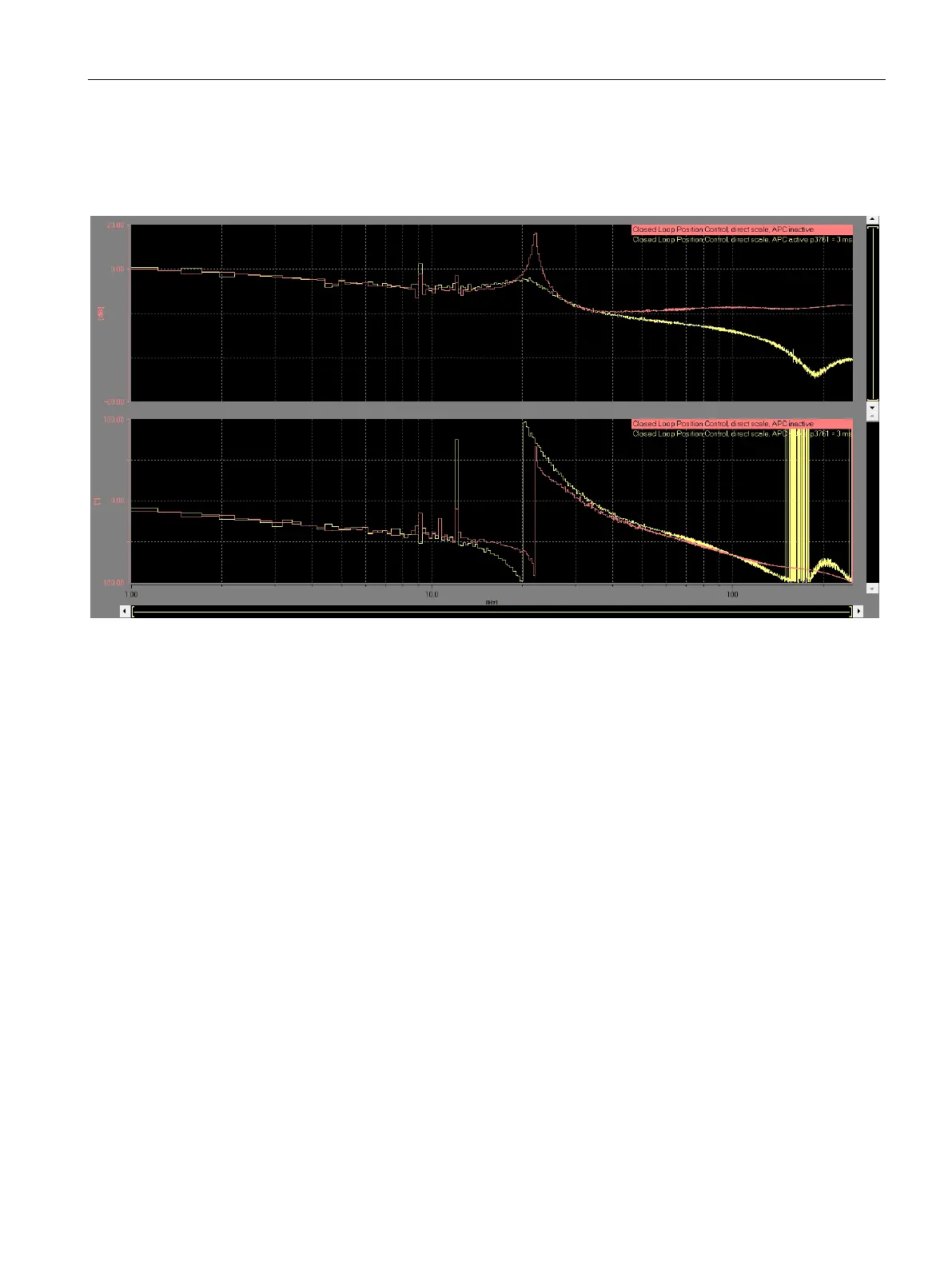 Yellow:  APC active, p3761 = 3 ms: The oscillation is dampened. The position control gain can be kept - or even in-