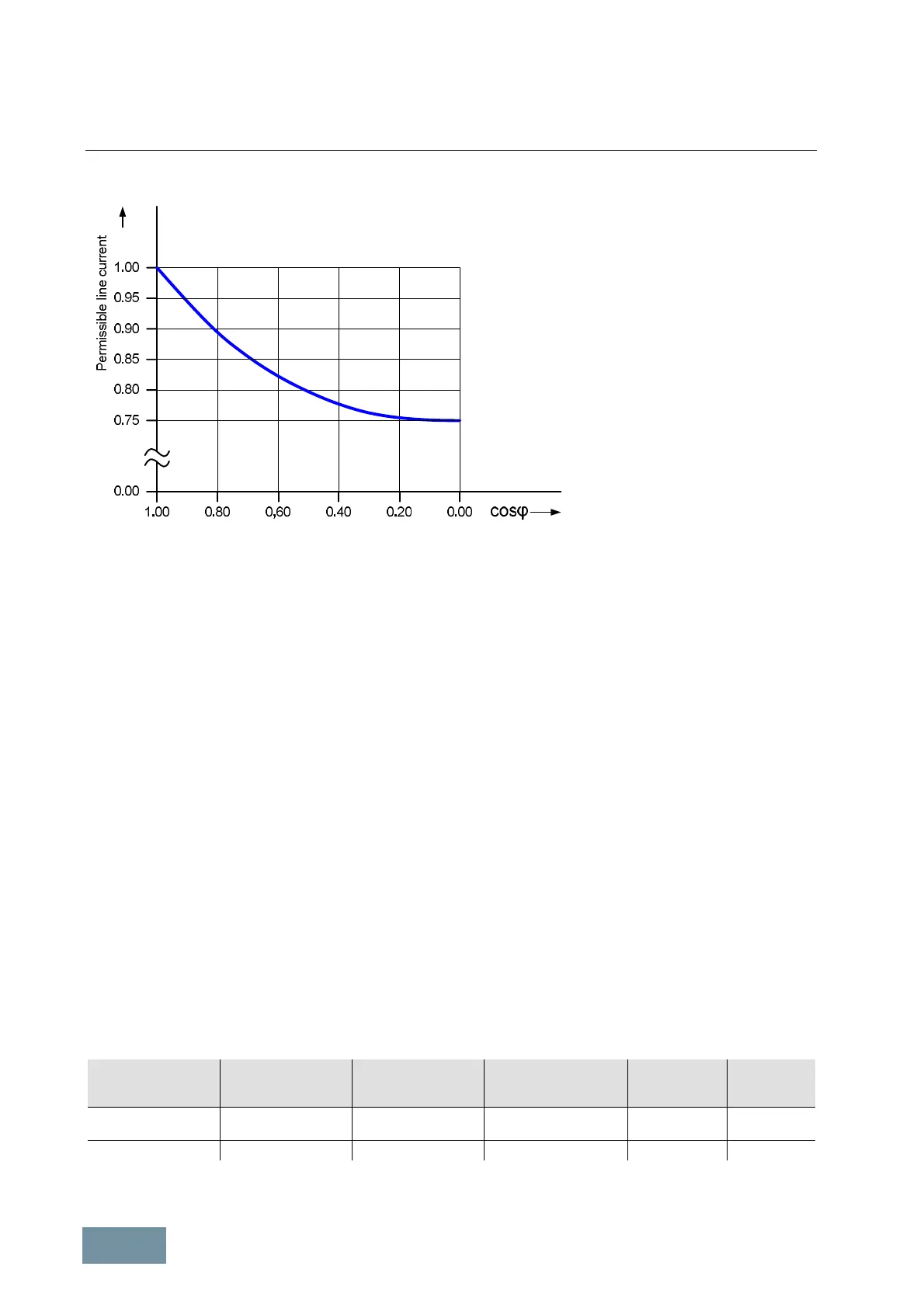 Permissible line current of the SINAMICS Active Infeed as a function of the line-side power fundamental factor cosφ