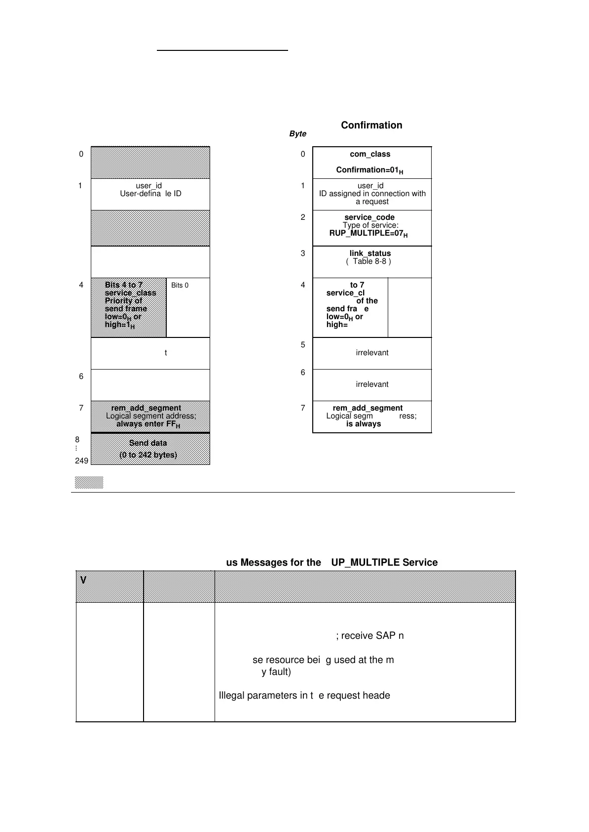 Figure 8-13 shows the request and confirmation structures for the RUP_MULTIPLE service.