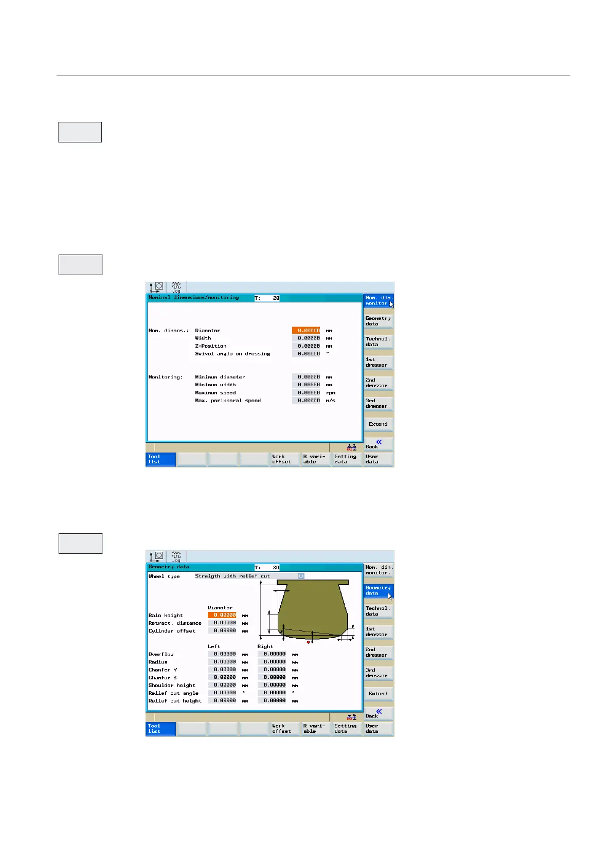 This function opens in input screen into which grinding wheel nominal dimensions and