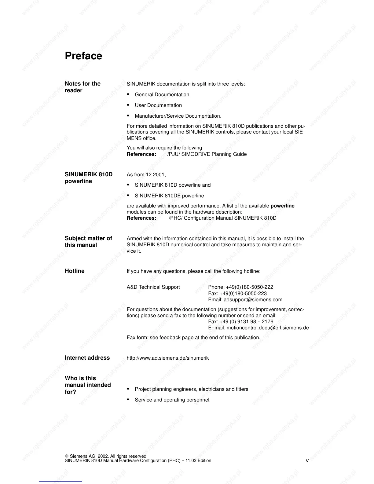 SINUMERIK 810D Manual Hardware Configuration (PHC) -- 11.02 Edition