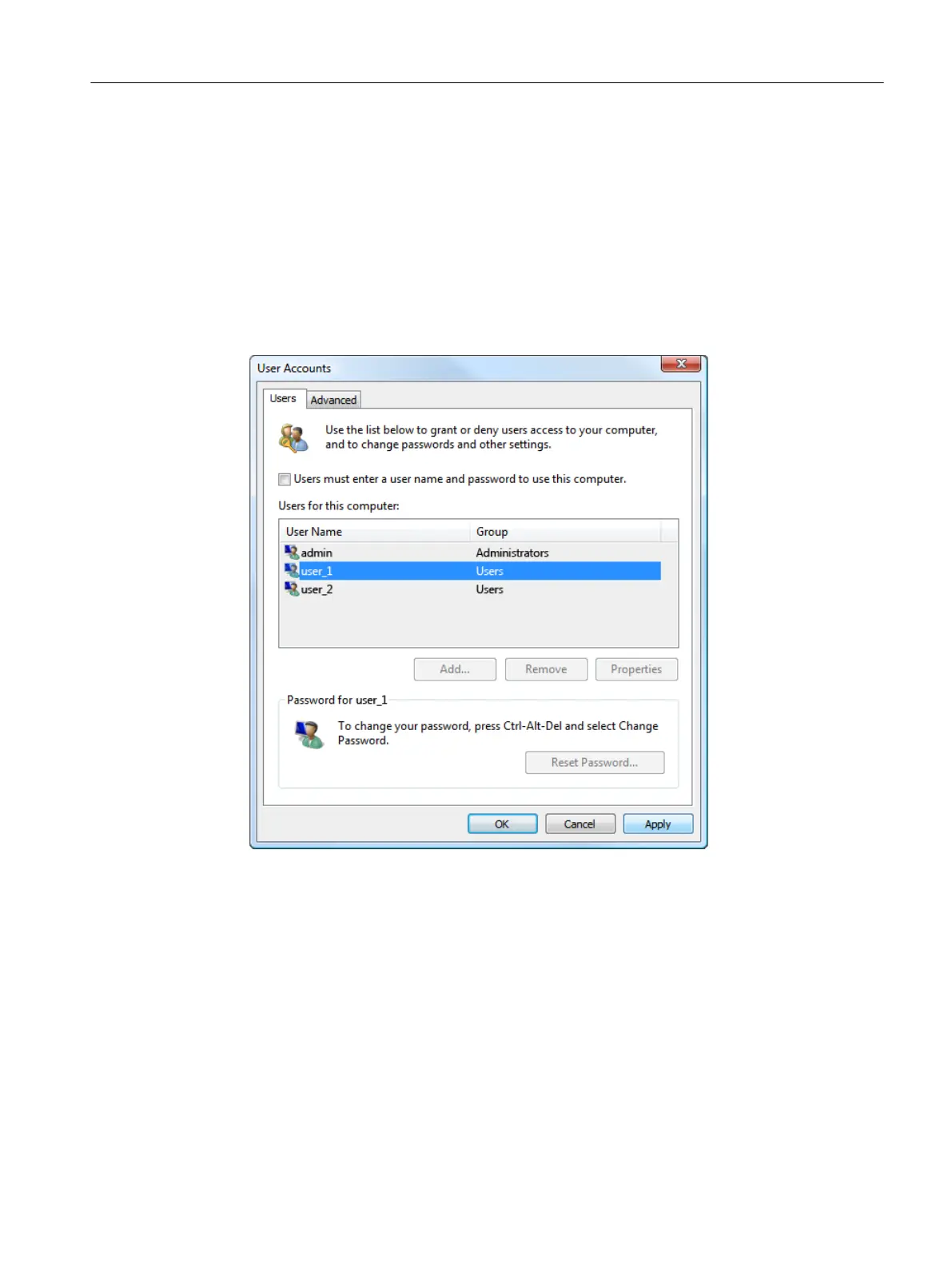 Figure 5-2 "User Accounts" dialog box in Windows 7: Please note that the deactivated checkbox