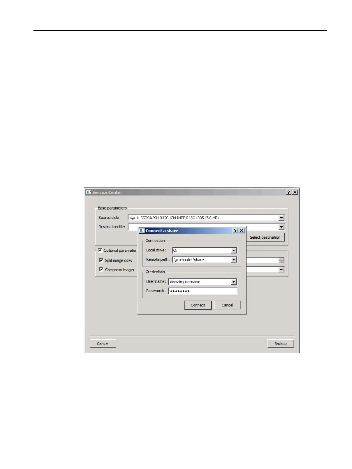In the Service Center, you configure network drives in the "Connect a share" dialog box. You