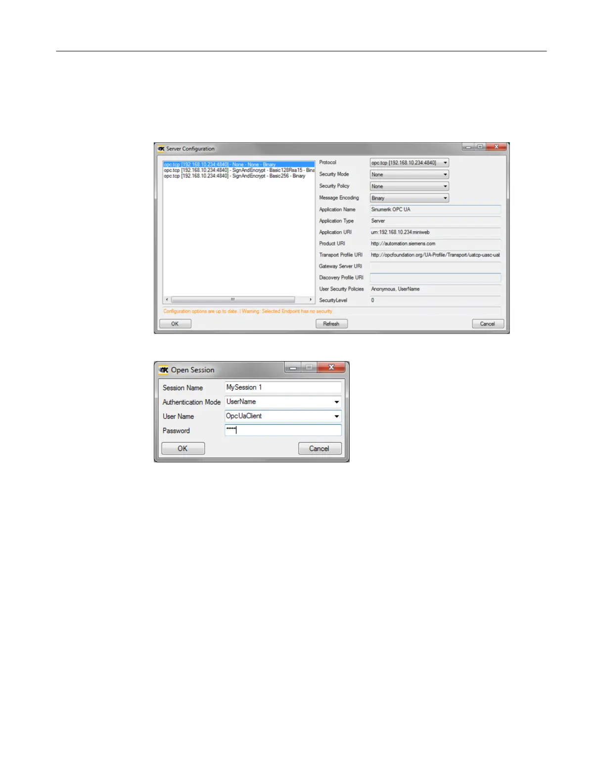 clicking "OK", enter the administrator user assigned when OPC UA was set up and the