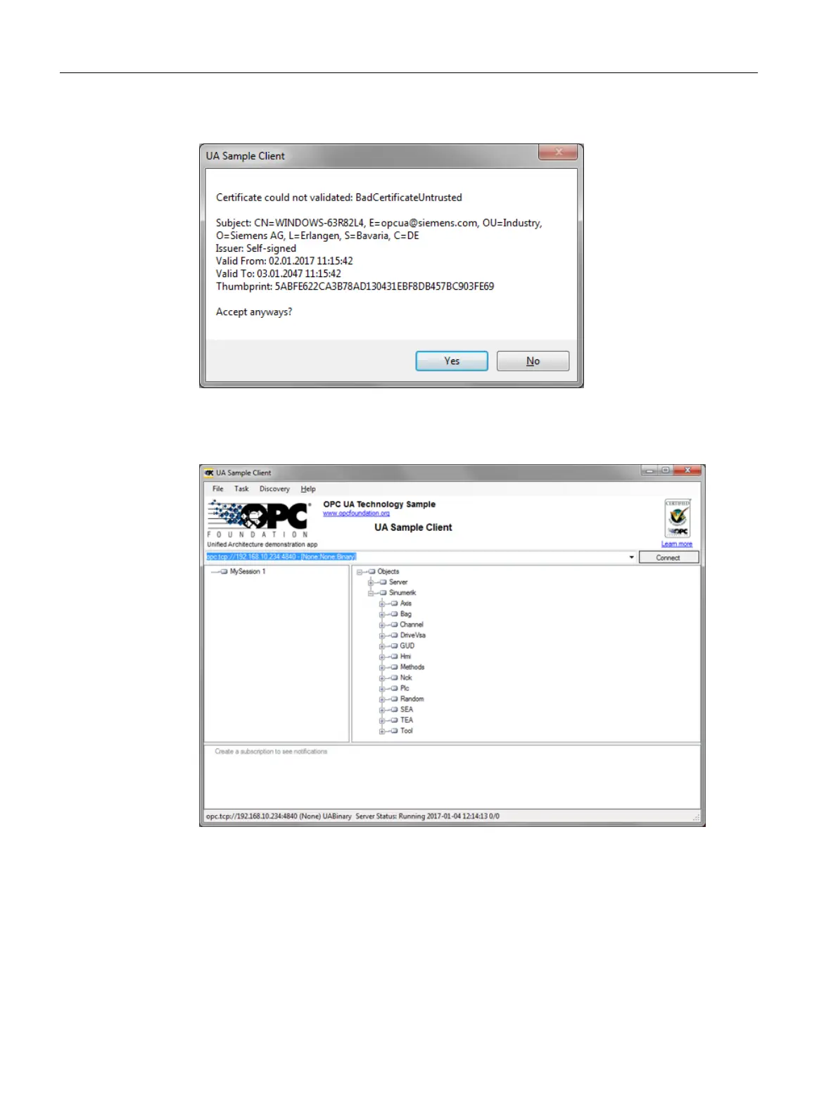 The connection to the SINUMERIK OPC UA server is now established and the available