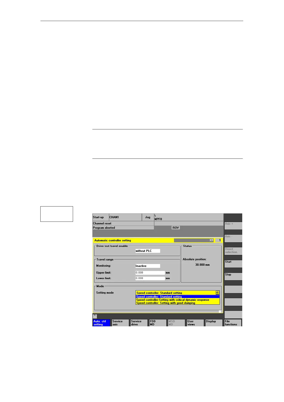 In the extended menu tree, press the “Auto. ctrl setting” softkey. The “Automatic