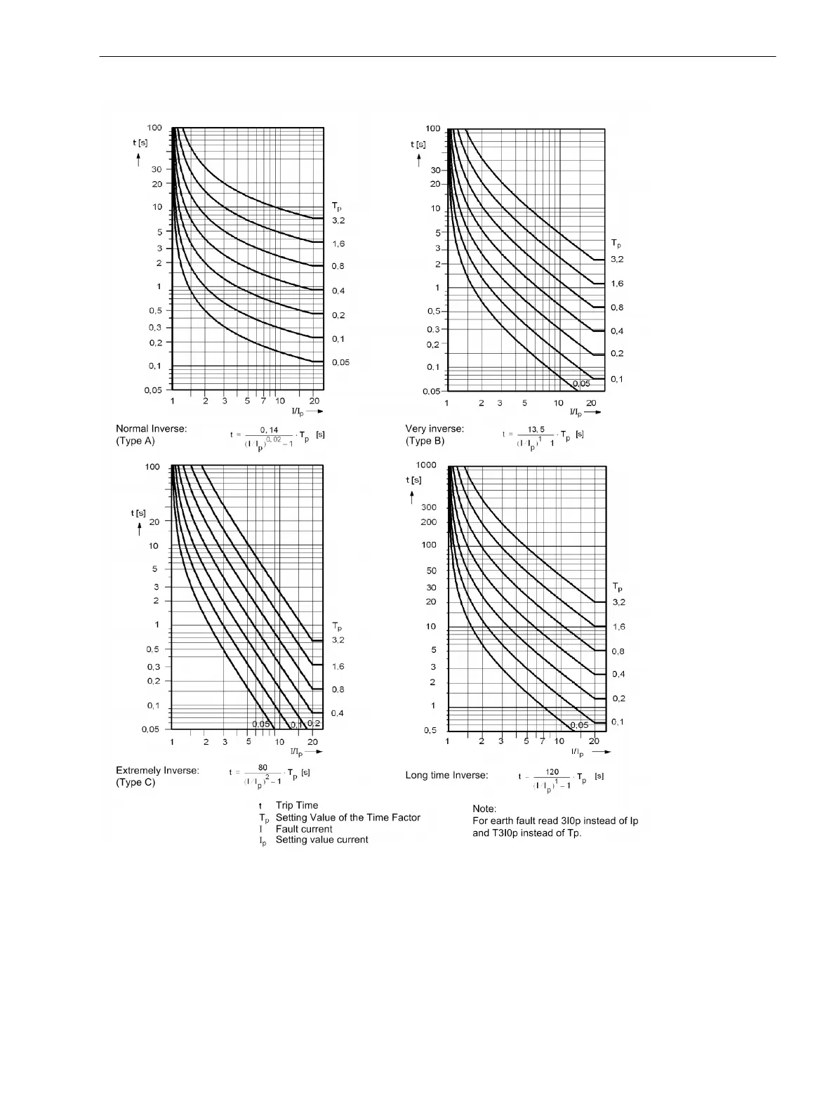 Trip time characteristics of inverse time overcurrent elements, acc. IEC (phases and ground)