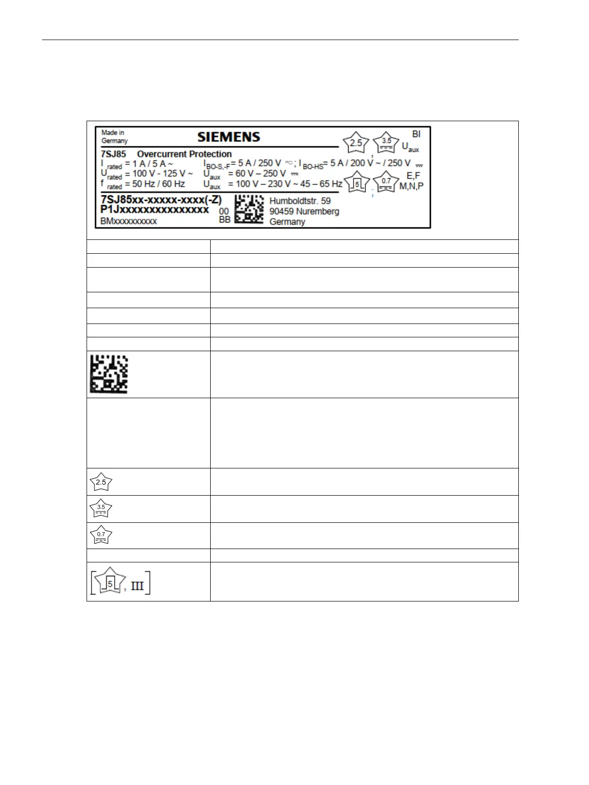 In the following table, the name plate of a modular device is explained as an example. The name plate is