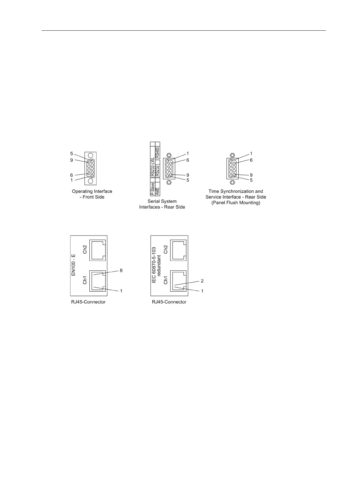 The following tables illustrate the pin assignments of the various serial device interfaces, of the time synchro-