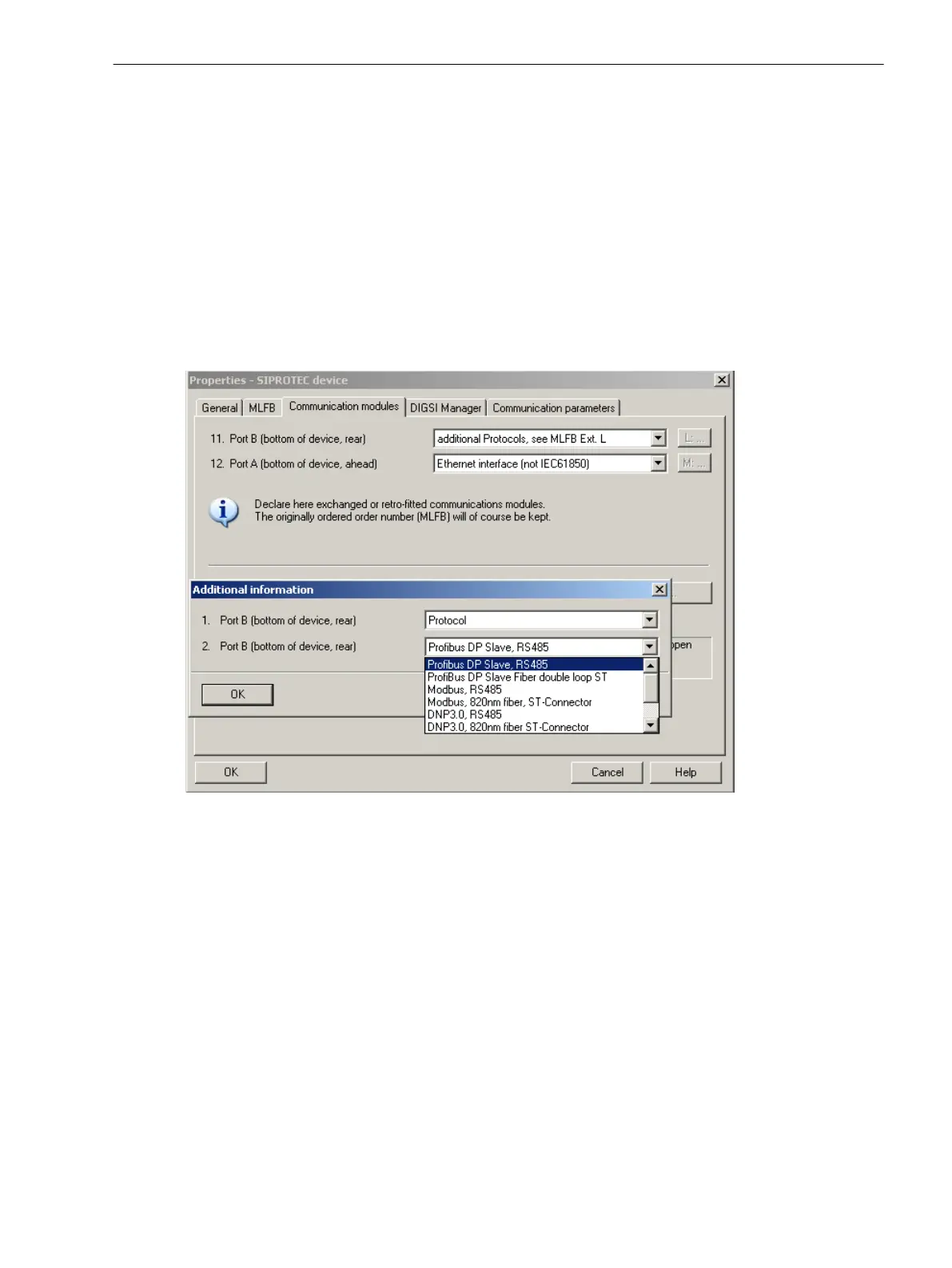 in the properties box Communications modules. For Profibus DP, Modbus or DNP3.0, the entry additional