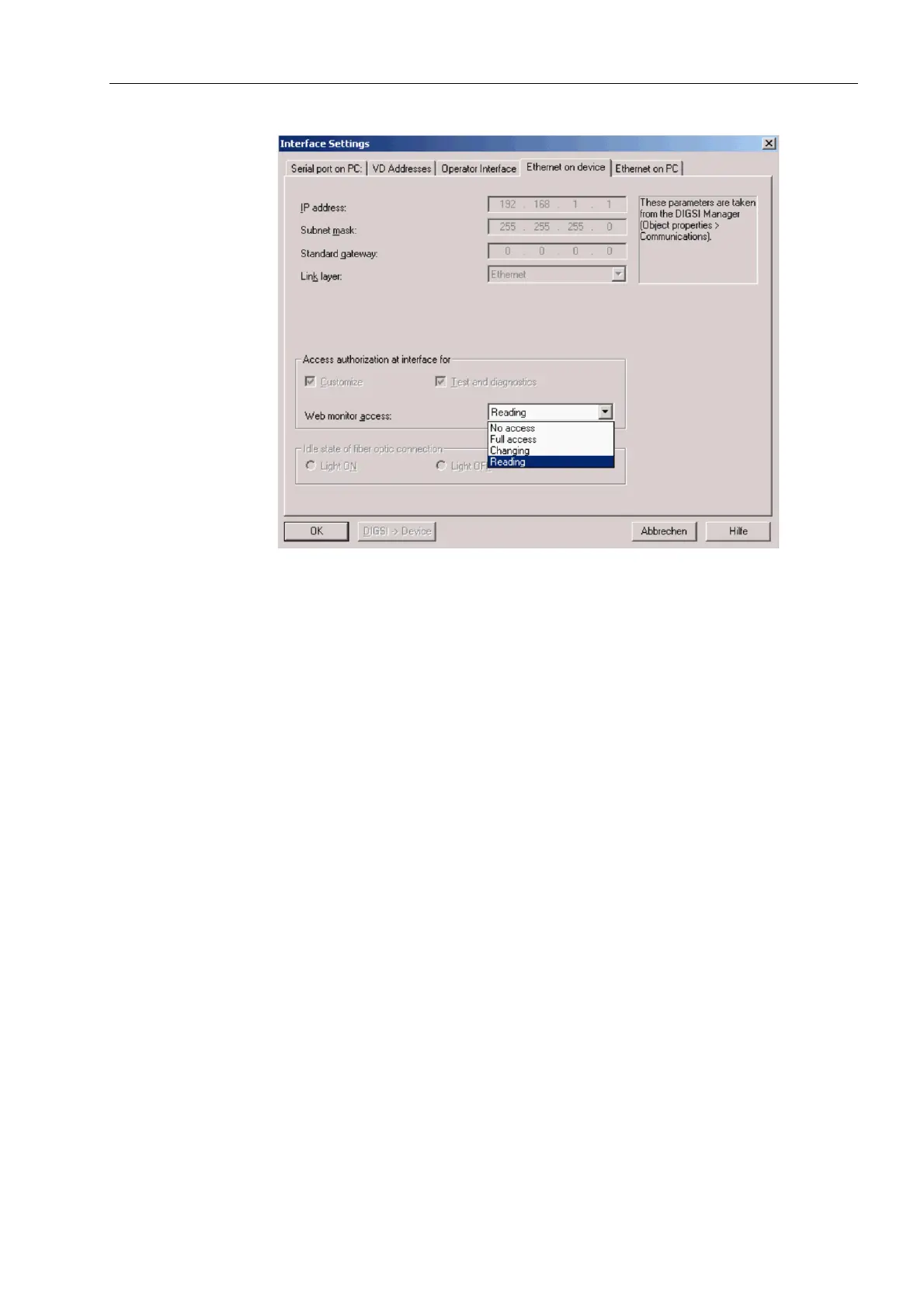 Figure 7-3 Setting the authorization for the Web Monitor for an access via Ethernet interface
