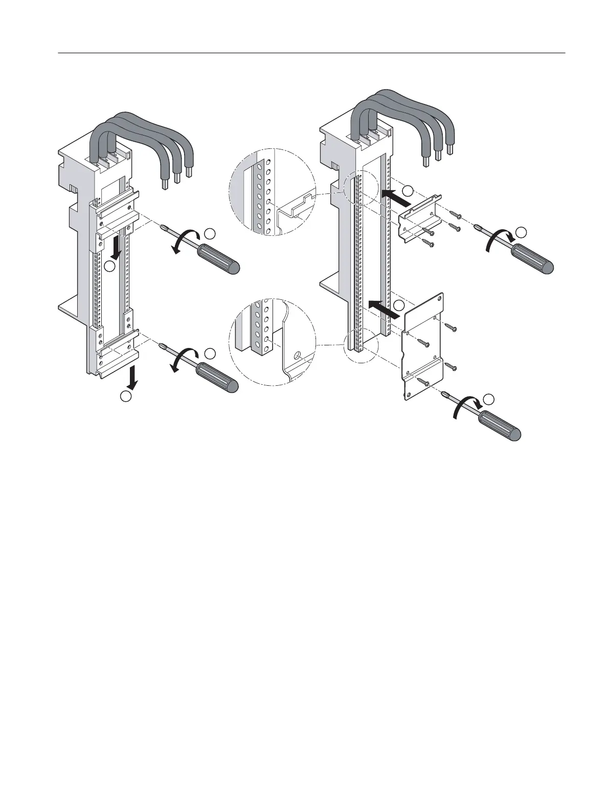 ⑦/⑧ Screw the fastening plate tight to the busbar adapter.