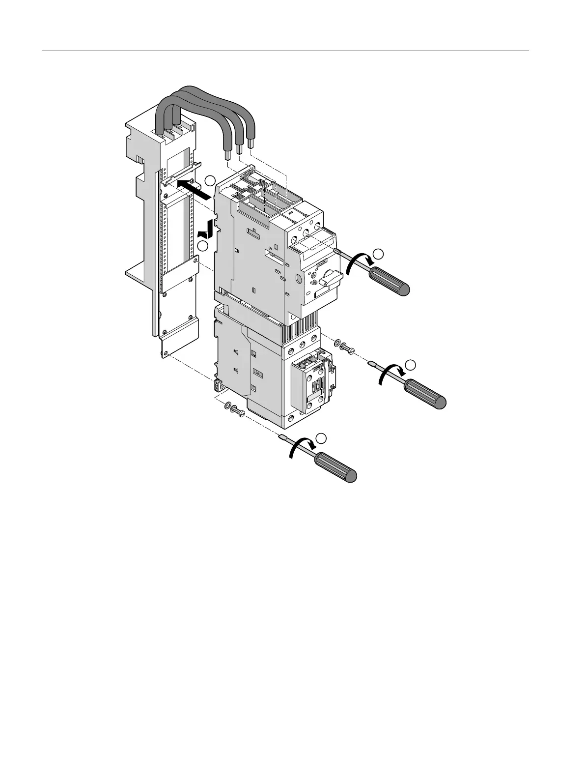 ⑪ Screw the contactor tight diagonally into the openings provided using two M4 screws, plain