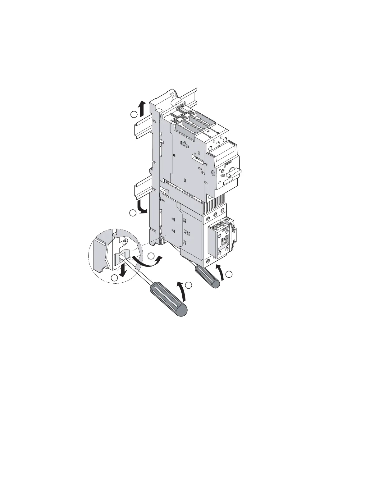 The procedure for disassembling the DIN rail adapter with mounted direct-on-line starter of