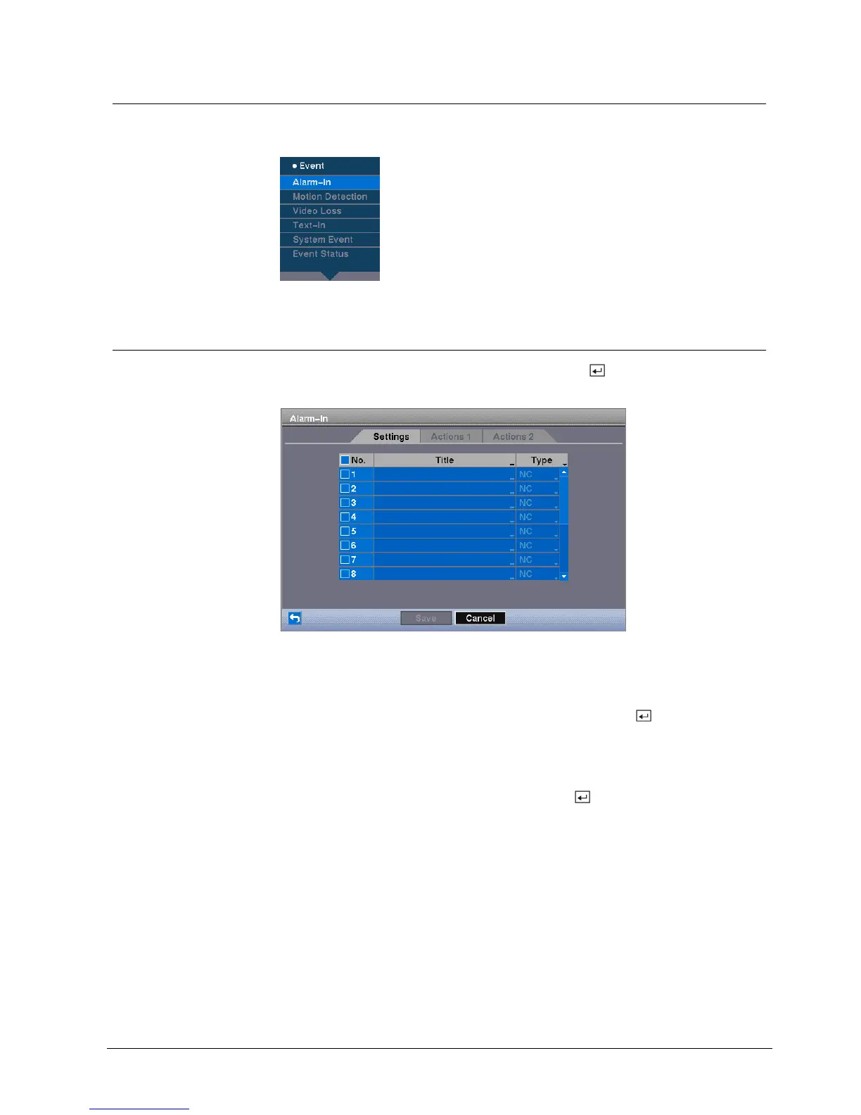 alarm. You can set up each input on the Alarm-In screen. You can turn each input