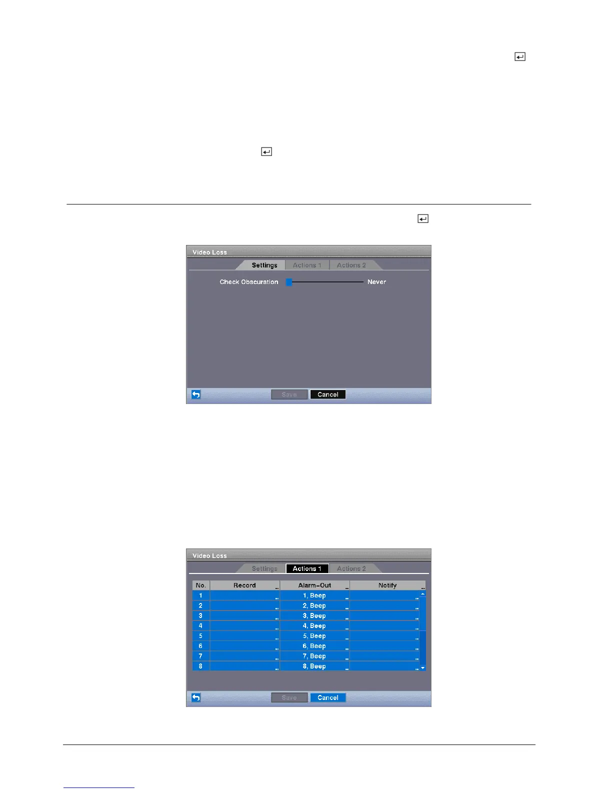 Î The Video Loss Actions 1 and Actions 2 screens display.