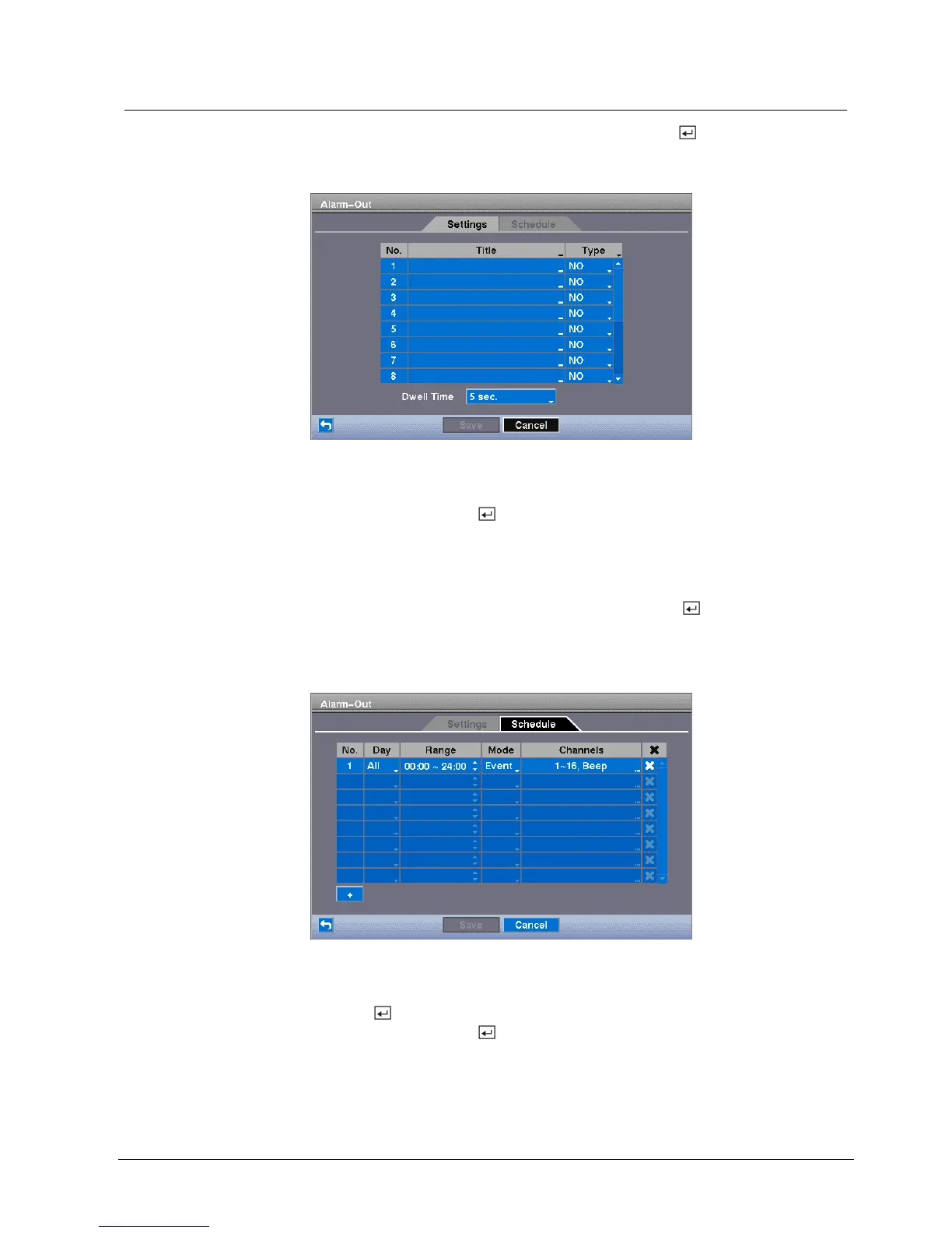 You can add and edit alarm output schedules on this screen. Highlight the "+" and