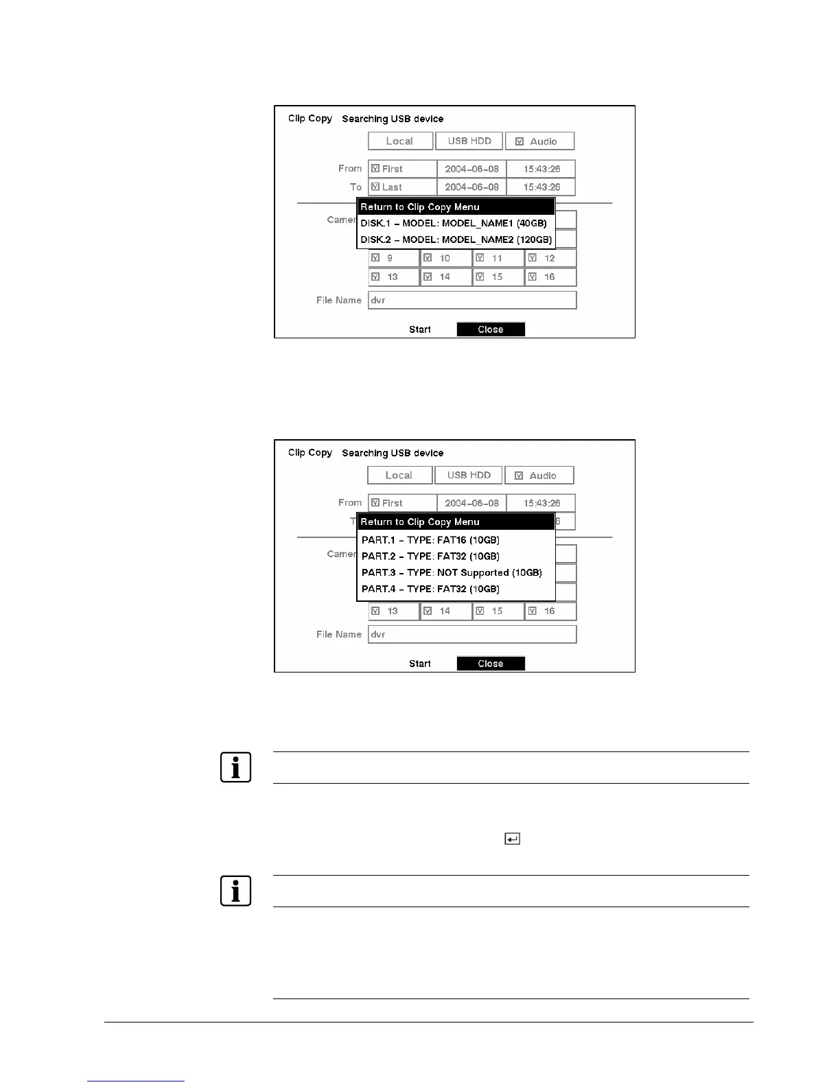 Once you select the drive and partition to use for clip copy, the DVR will display the