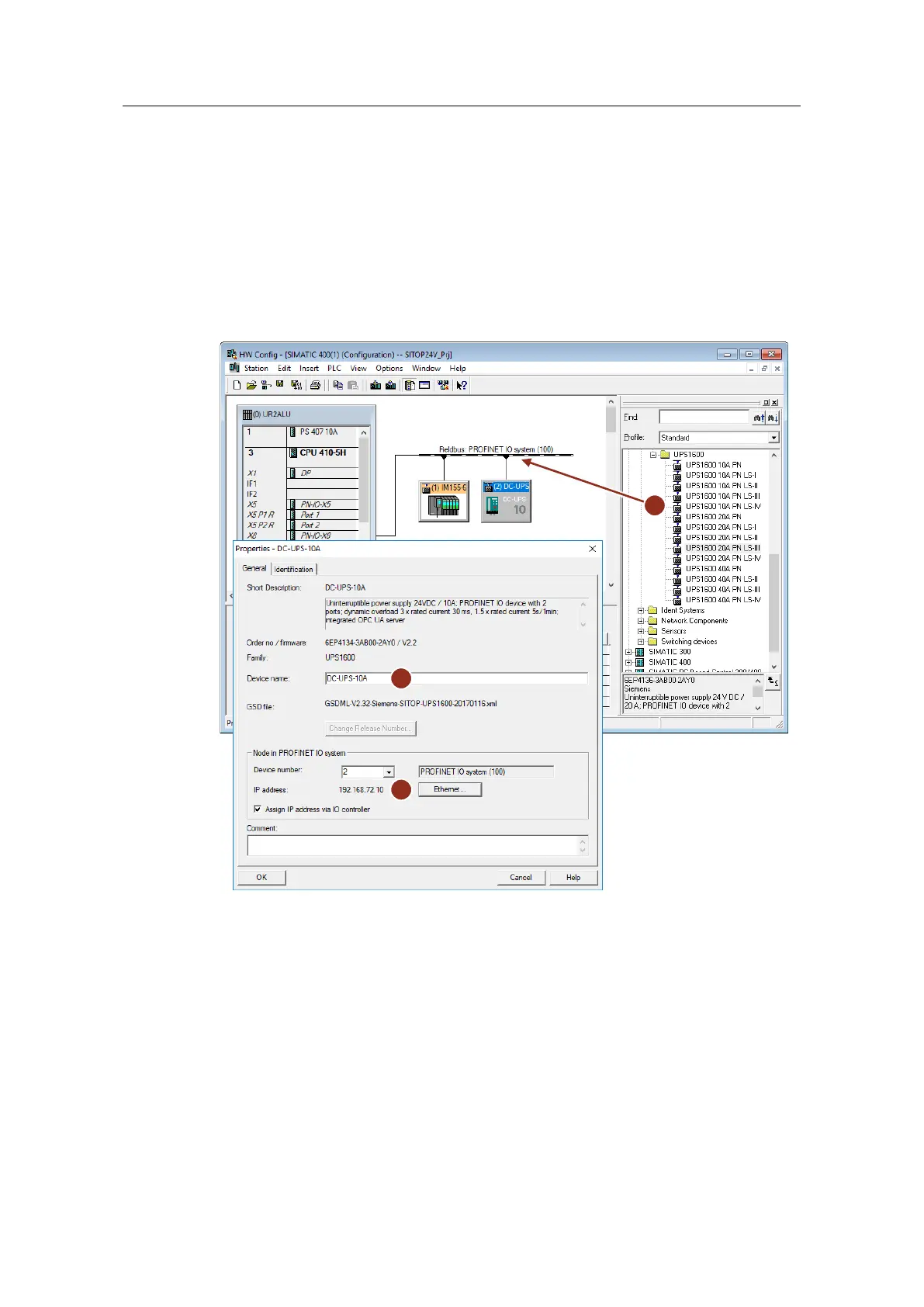 1. Drag the UPS1600 from the device catalog (1) onto the PROFINET IO system