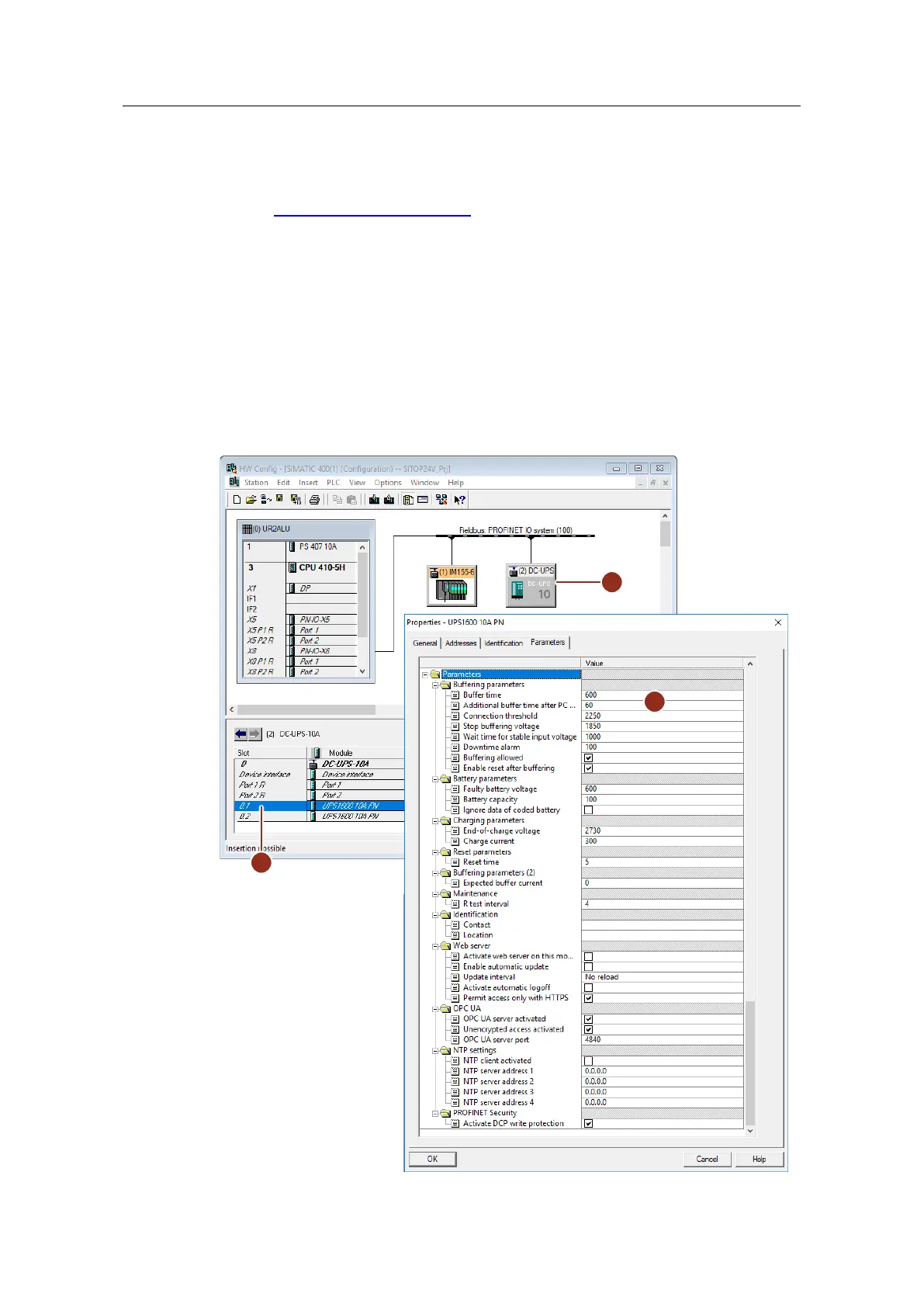 2. Open the properties of the "UPS1600 xxA PN" module (2) on slot 0.1 by