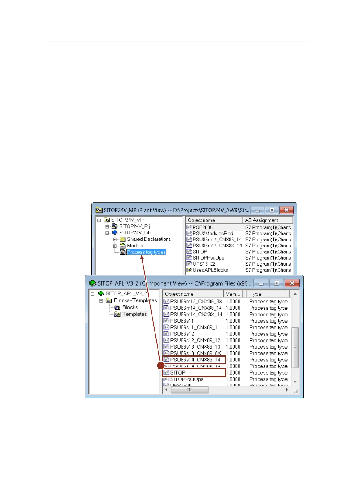 The SITOP library contains the appropriate function modules and process tag