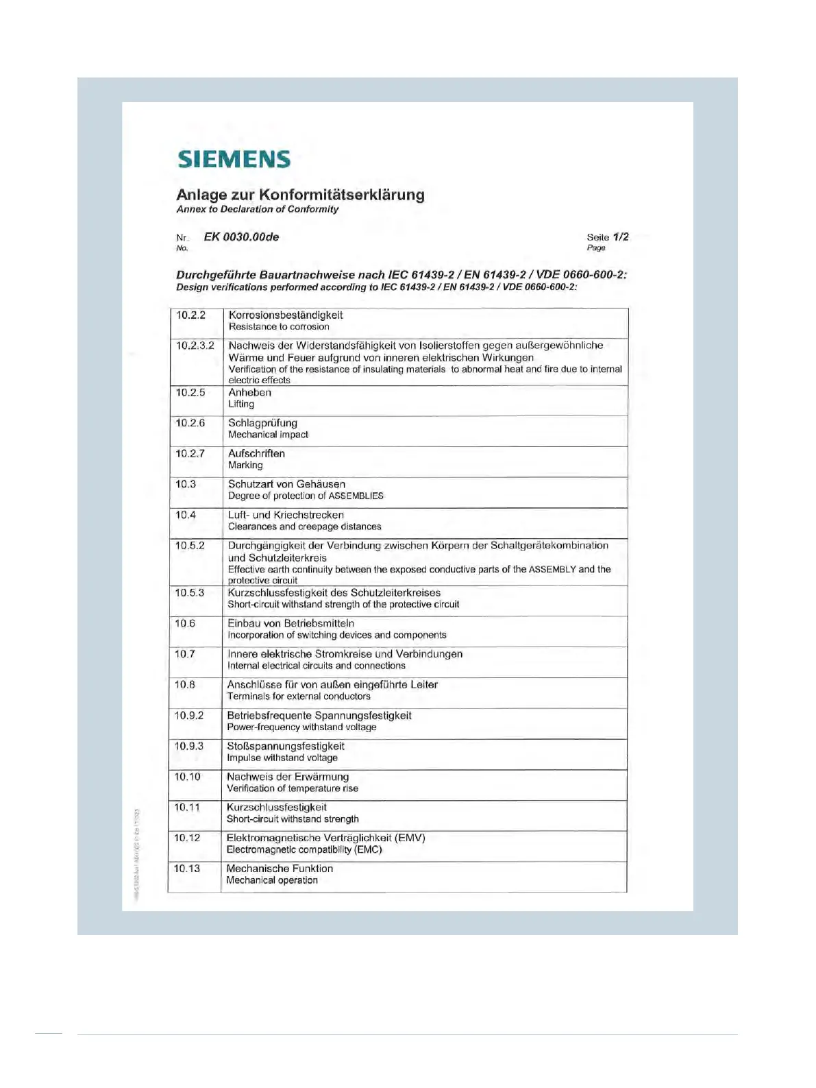 Fig. 9/6: Declaration of Conformity for SIVACON S8 regarding design verification - Annex Page 1/2