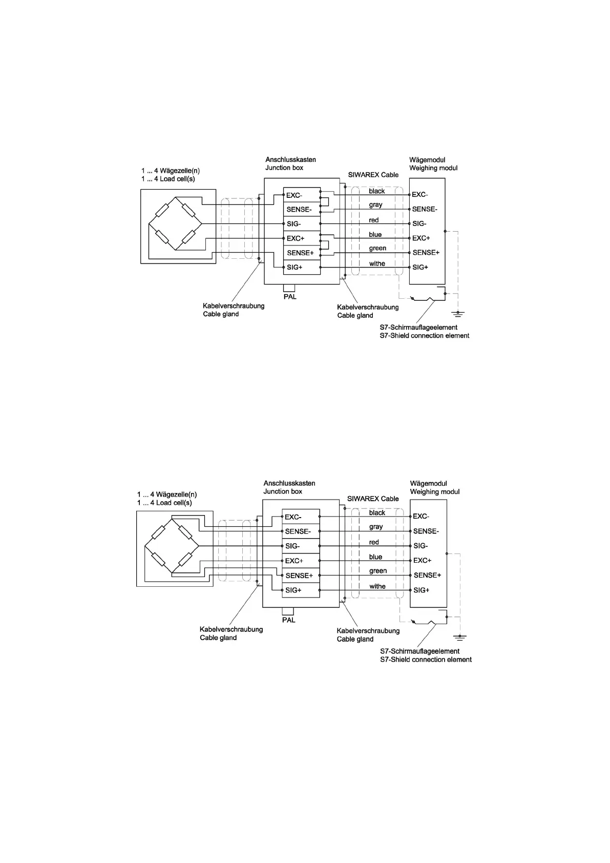 The two images below show load cell connection using 4-wire and 6-wire systems.