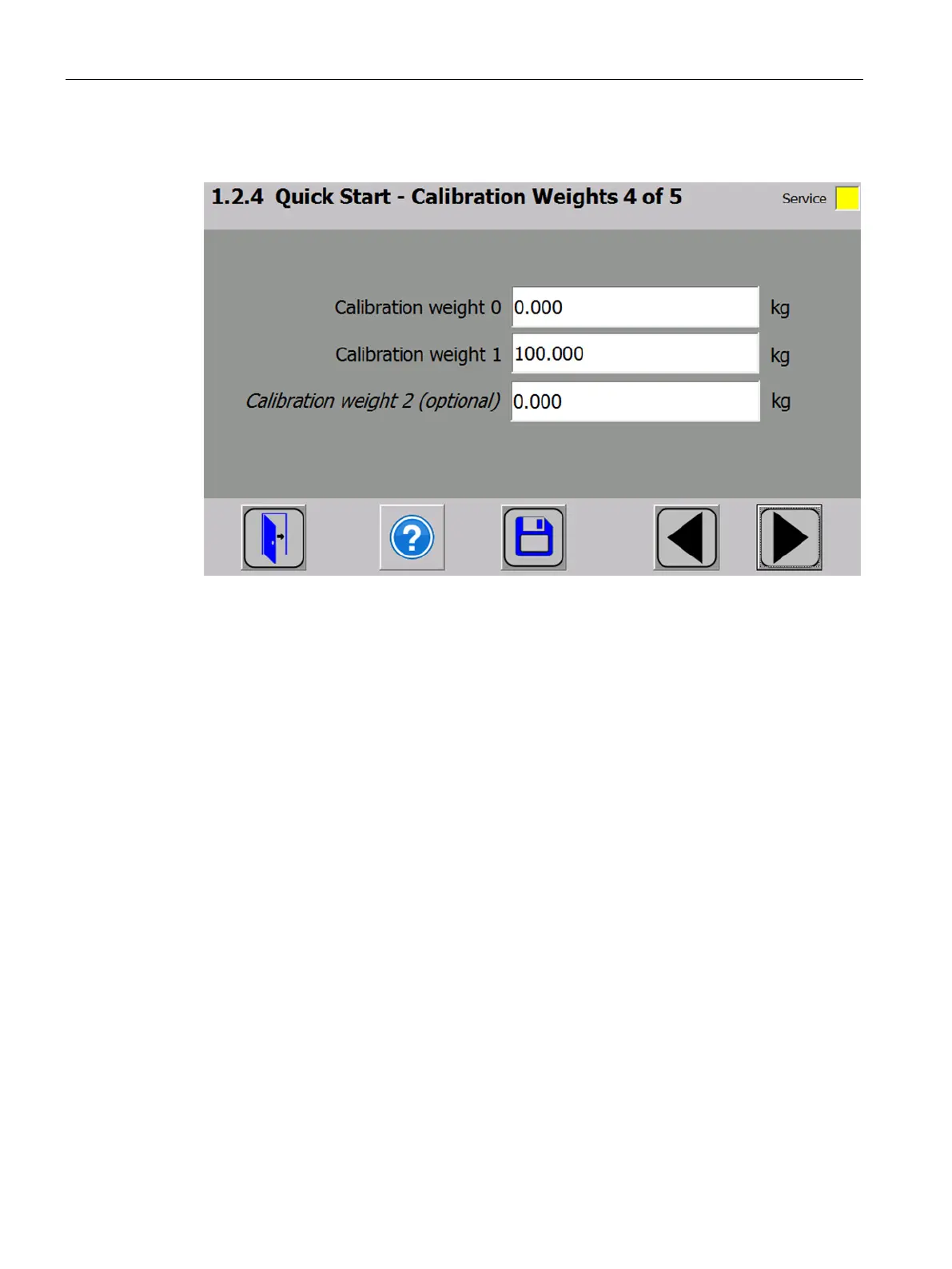 parameter remains as 0 kg. "Calibration weight 1" usually defines the first reference point of
