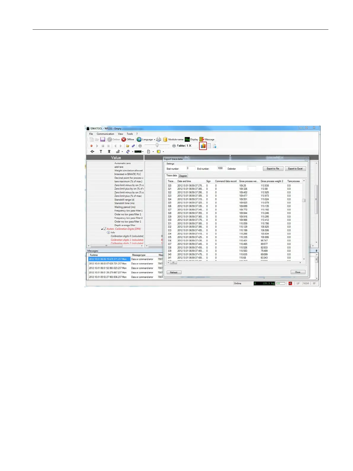 Scale traces can be recorded and exported using SIWATOOL. The recording is started and