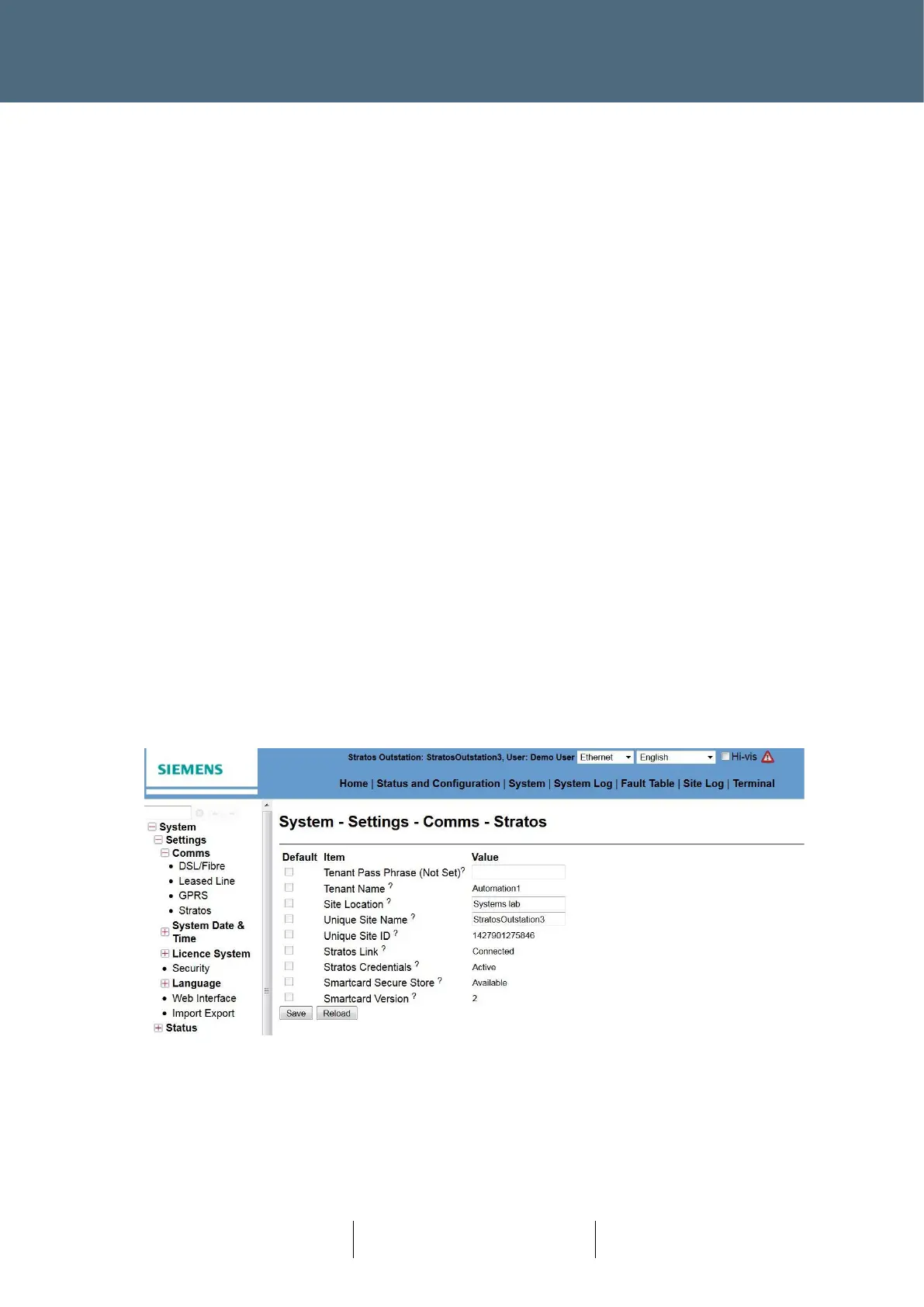These items are set on the System – Settings – Comms – Stratos configuration web page.