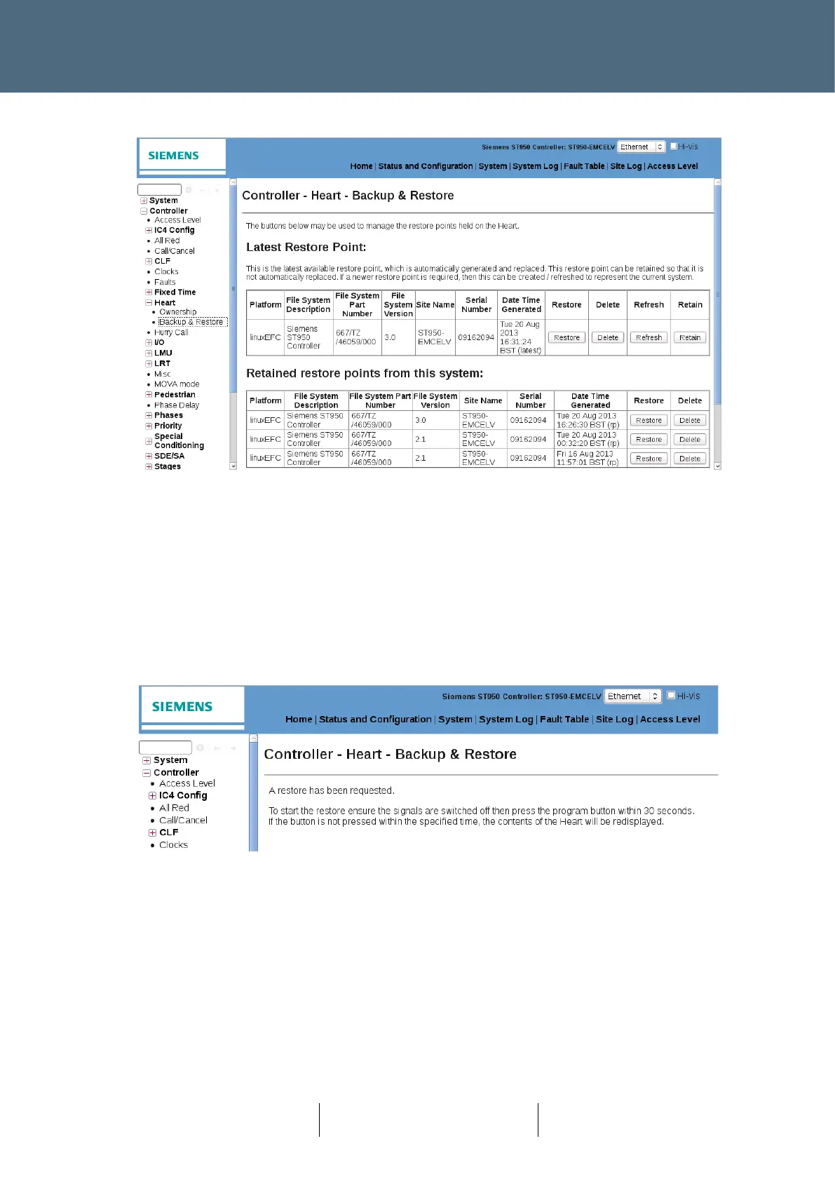 are shown on the Controller - Heart - Backup & Restore web page. Restoration to one of the listed